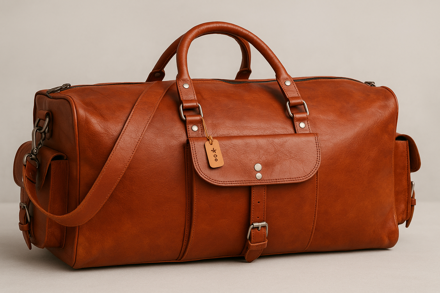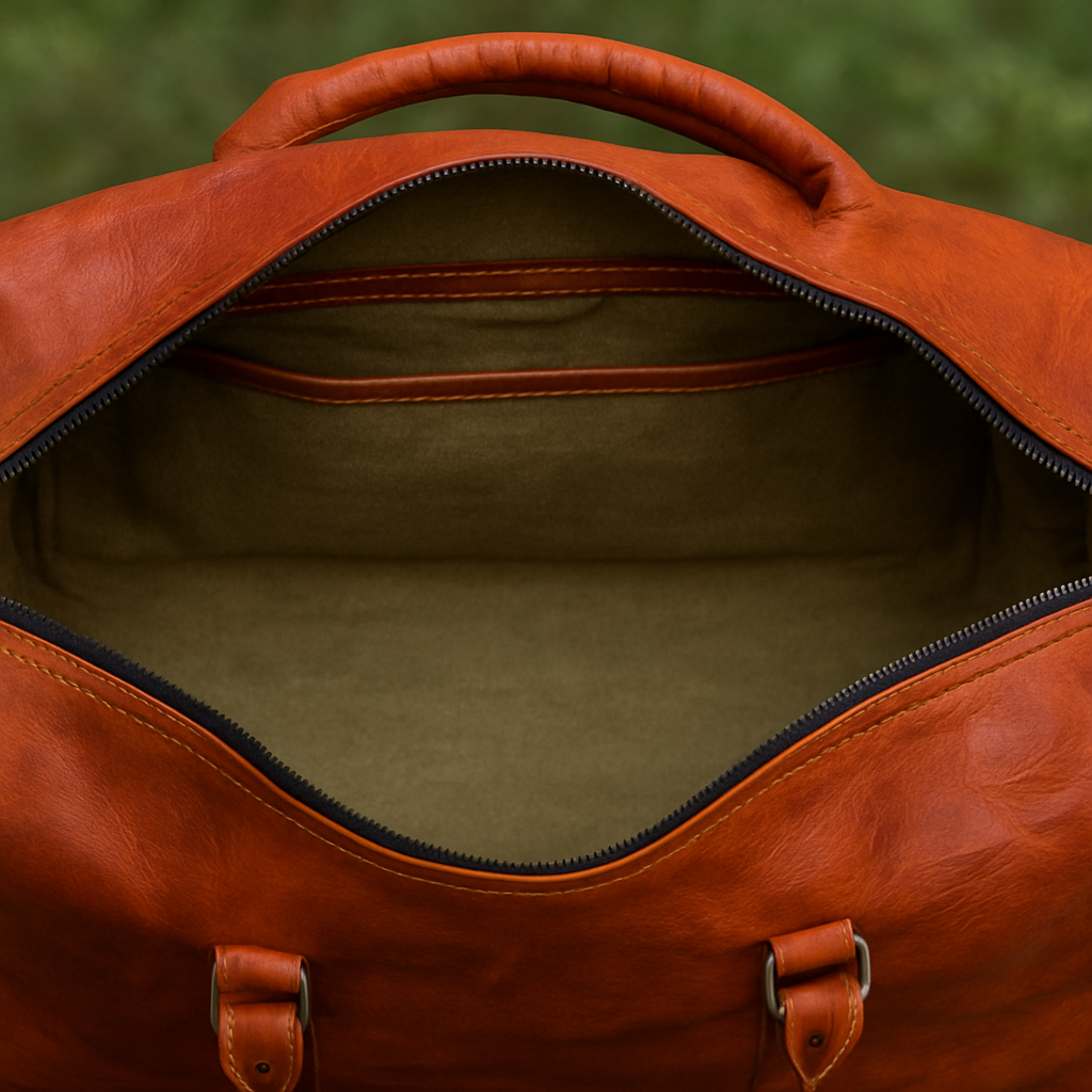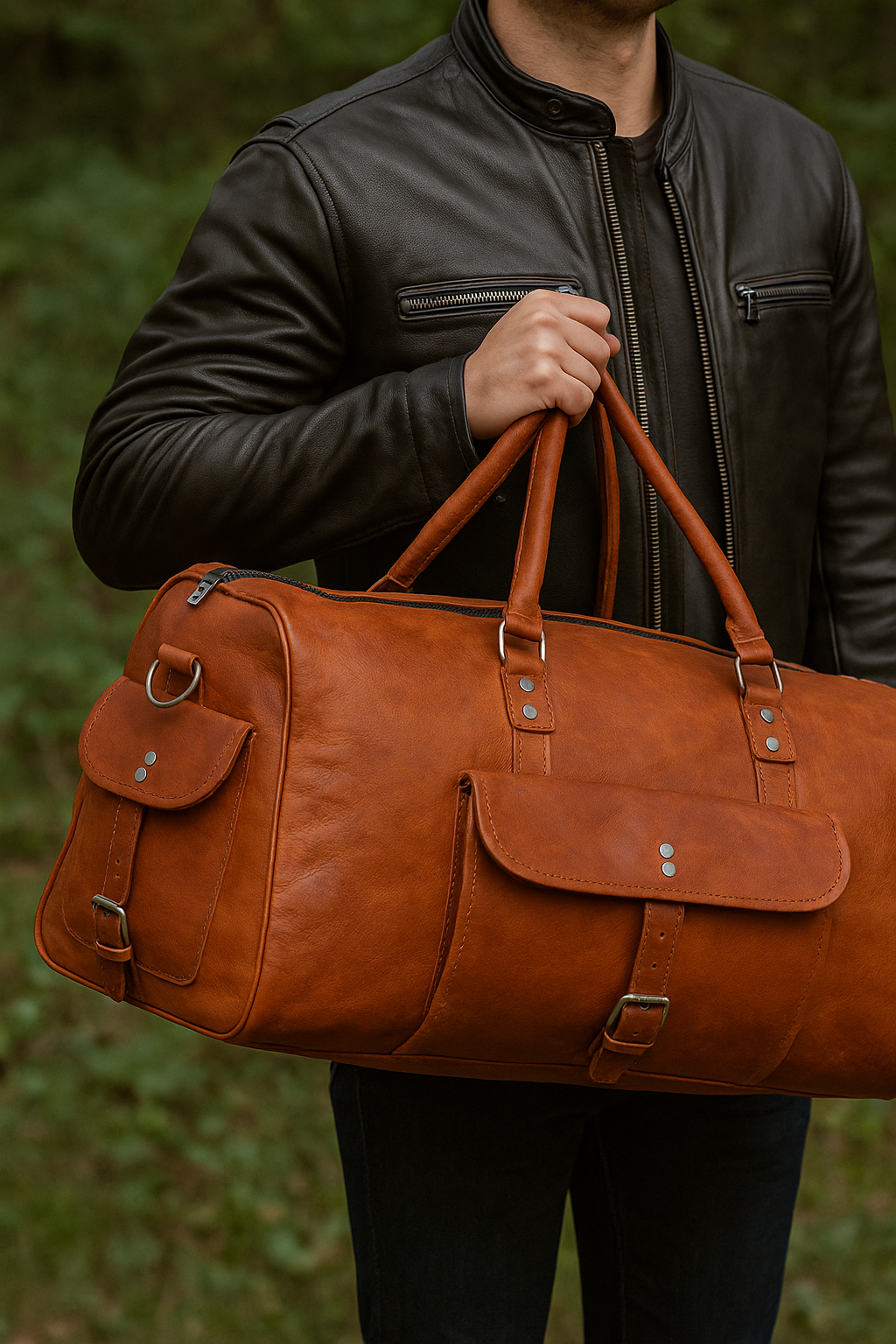 Crafted from premium full-grain leather, this duffle bag blends timeless style with rugged durability. Its rich reddish-brown patina and natural creases give each bag a unique character, while the olive-green fabric lining adds a refined touch inside. Designed with buckle-secured side pockets, a spacious main compartment, and sturdy brass hardware, it offers both function and style for travel, work, or weekend adventures. Carry it by the reinforced handles or detachable shoulder strap — this bag is built to last a lifetime of journeys.